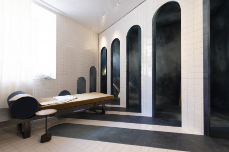 Это медитационное пространство «с загадочными глубинами», воображаемое двумя архитекторами. Расположенное вдали от других комнат, на первом этаже, это место успокаивает. Плитки белой эмали от земли до стен, подчеркивают созданное авторами второе пространство за арками, которые рисуют на полу непрозрачные тени. Этот тромпе-лёйль внезапно предлагает богатый и глубокий горизонт для созерцания. Дикая шелковая занавеска Альбертина и шелк Эко, расположенные на дне, приносят оттенки блеска или шероховатости в тонком пространстве в мельчайших деталях и чрезвычайно утонченны.