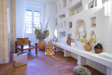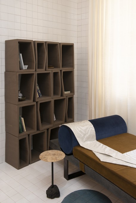 Это библиотека / читальный зал, который задумал дуэт. Поэтический, легкий и нежный, с дышащим пространством. Шторы «Colibri» дарят помещению мягкий свет. Самой важной частью комнаты является библиотека, ниши, выкопанные из стены, для размещения предметов и книг, собранных на протяжении многих лет, «таким образом моделируя своими руками случай своей памяти», завершают образ комнаты, созданный архитекторами.
