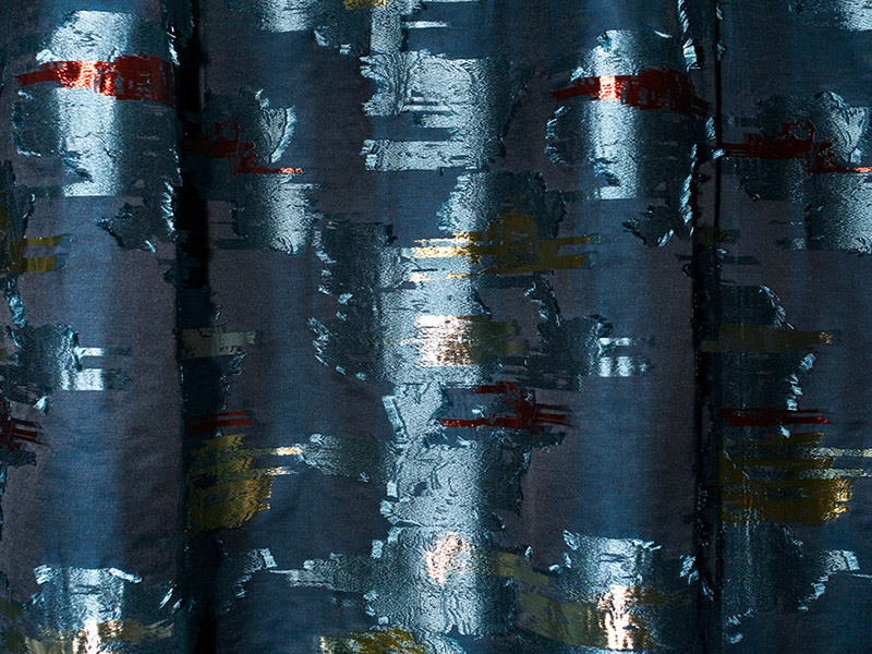 Лампасы с абстрактным цветочным мотивом, созданные благодаря особым ткацким приемам, таким как переплетение нитей и фил-купе, которые создают эффект обратного жаккарда.