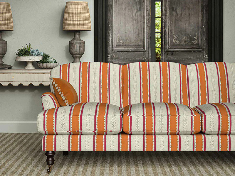 Полоски делают этот цвет еще более комфортным для восприятия. Дизайн текстиля Fruit Salad чередует мандариновые и малиновые полосы на мягком льняном фоне, разбивая цвет на части, чтобы он воспринимался как ритмичный, а не подавляющий. В результате получается спокойная и уверенная в себе оранжевая ткань для диванов — яркая, но уравновешенная нейтральными элементами, благодаря чему комната кажется теплой и уютной, а не театральной.