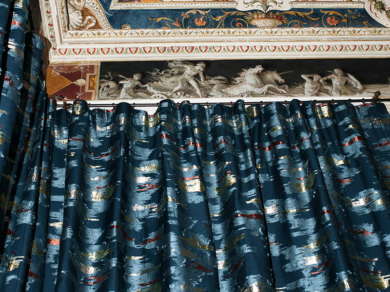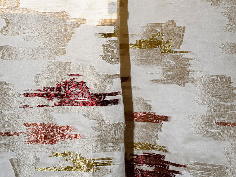 Лампасы с абстрактным цветочным мотивом, созданные благодаря особым ткацким приемам, таким как переплетение нитей и фил-купе, которые создают эффект обратного жаккарда.