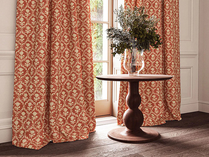 Оранжевый не всегда должен быть кричащим. В традиционных узорах он часто предстает в более спокойных оттенках — коралловом, абрикосовом или персиковом. Ткань Albertina прекрасно передает эту мягкость. Букеты роз и полевых цветов на фоне теплого кораллового фона придают рисунку легкий летний шарм . Иногда достаточно небольшого цветового акцента на окне — как свежих цветов на столе, — чтобы оживить пространство.